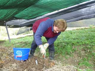 Im Herbst ist nicht mehr viel von den Stauden zu sehen, da sie im Herbst einziehen. Auf einem der Beete mit dem vierjährigen Ginseng, den wir heute ernten, liegen einzelne, bräunlich verfärbte Blätter. Andere Stauden sind schon völlig eingezogen, deshalb müssen wir vorsichtig mit den Schäufelchen ans Werk, um die Wurzeln nicht zu verletzen. Die Erde ist krümelig und locker, so dass das Arbeiten leicht geht. Die Schäufelchen müssen tief genug angesetzt werden, bevor vorsichtig die Wurzel gelockert und angehoben wird, damit sie nicht verletzt wird. Ihre Farbe ist weisslich, manche haben eine gelblich-rötliche Farbe, die sich aber beim Trocknen angleicht. Bild oben re: Panax ginseng im Herbst. Bild unten: Eine relativ grosse, vierjährige Ginsengwurzel.