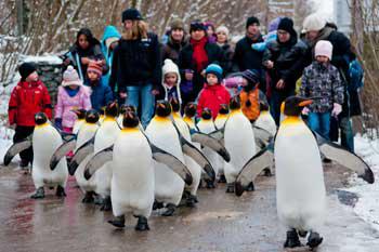 So lange die Temperaturen unter 10 Grad bleiben, brechen sie täglich um 13.30 Uhr zu ihrem Spaziergang auf: im Frack und unter lautem Geschnatter.