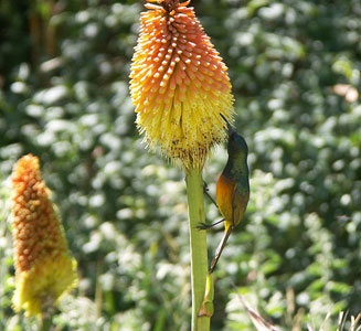 Bild: Fackellilien (Kniphofia sp.) werden in Südafrika von Nektarvögeln (Sunbirds) bestäubt (Wiki Commons).